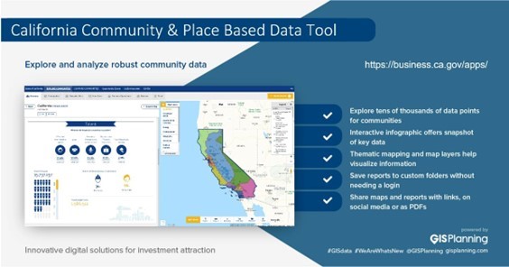 Visualize and explore robust economic, workforce, business and demographic data and maps.The free tool was developed by the Governor's Office of Business and Economic Development (GO-Biz) and requires no account.