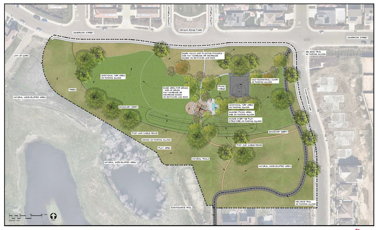 Phase 1 of the park was completed in Summer 2024, which includes two lighted pickleball courts, a fenced off-leash dog park, multi-use paved paths, a covered picnic area, open turf areas and restrooms.