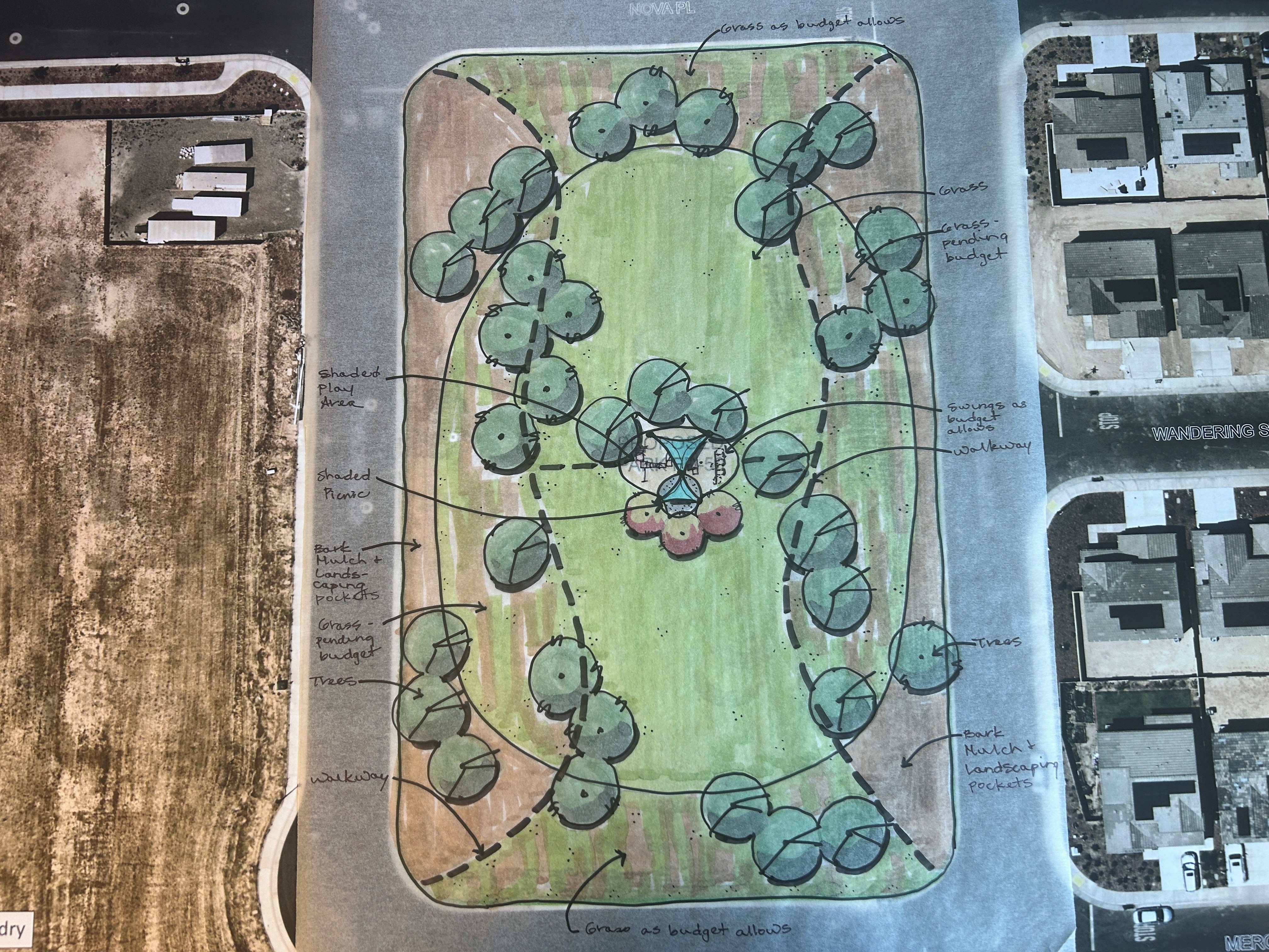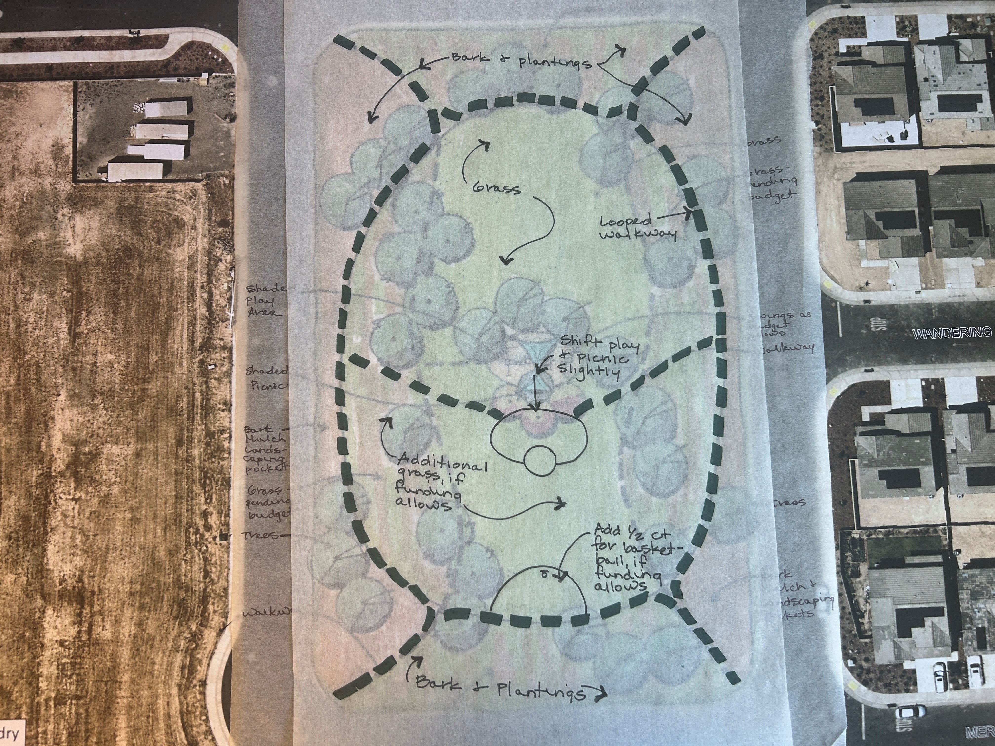 Due to budget constraints and fluctuating construction pricing, the attached exhibit illustrates the City’s approach to bidding this park project. It indicates what will be included in the base bid and what is considered alternate pricing for what can be added should budget allow. The target to begin construction is late Spring/ Summer 2025.