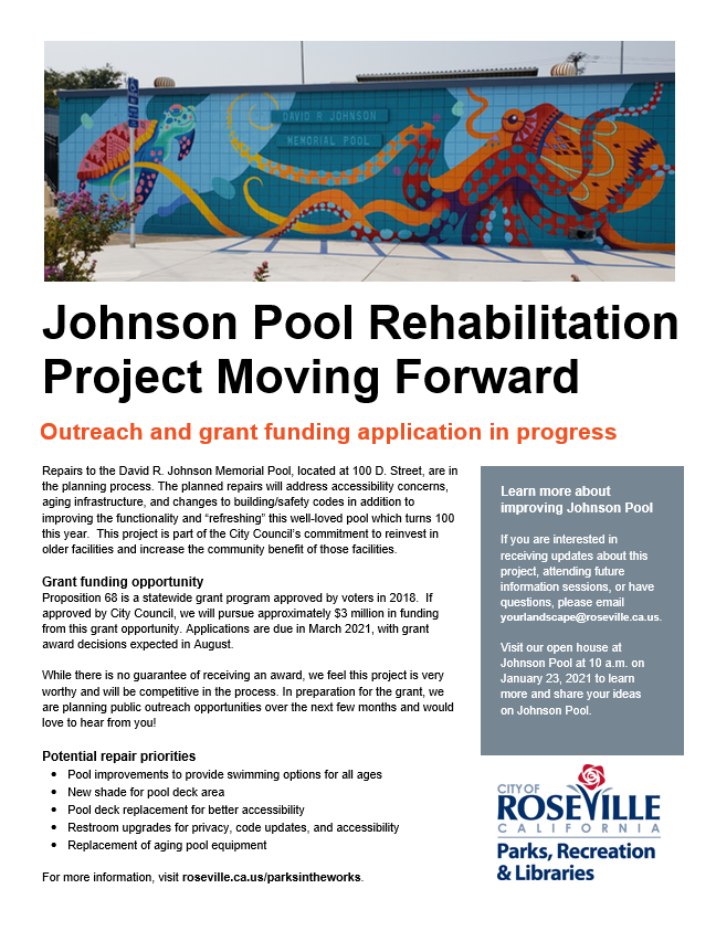 The Roseville Aquatics Complex Renovation Project includes improvements to the locker rooms and showers to update this portion of the facility for accessibility and code compliance and will include replacement of components that have reach the end of life. In addition, the competition pool will be replastered.
