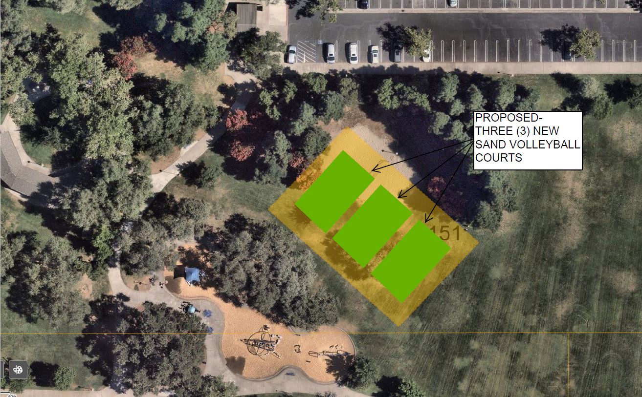We have seen a rise in usage in sand volleyball. With sand volleyball becoming a high school sport and the current impaction of the sand courts at another park, adding more courts at Kaseberg makes sense. A single court is not usable as people come in groups and the wait time is long. Three courts would increase use where multiple groups can play more and within a shorter period of time. These added courts will decrease the gap in our sand volleyball court inventory. This layout also considers the soccer fields and avoids any conflicts between the two.