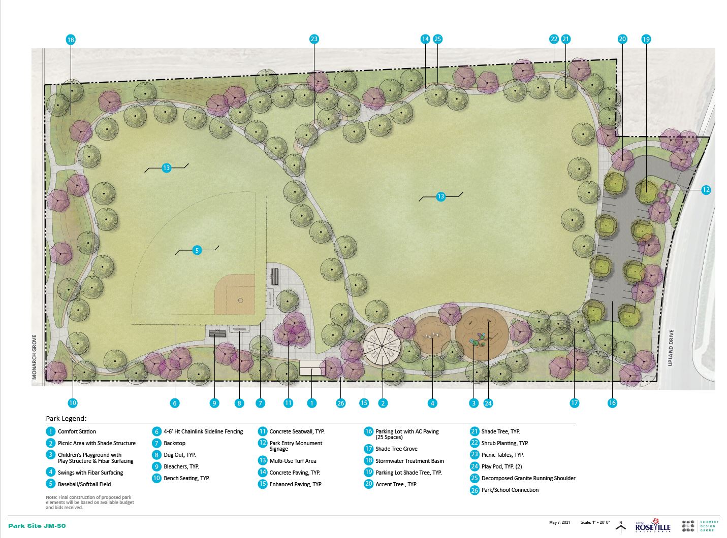 This is a 7.73-acre school park site in Roseville. Amenities to be constructed in this park include a playground, swings, a shaded picnic area, bathrooms, a softball field with backstop and dugouts, an off-street parking lot, walking paths, a multi-use turf area, planting and irrigation.