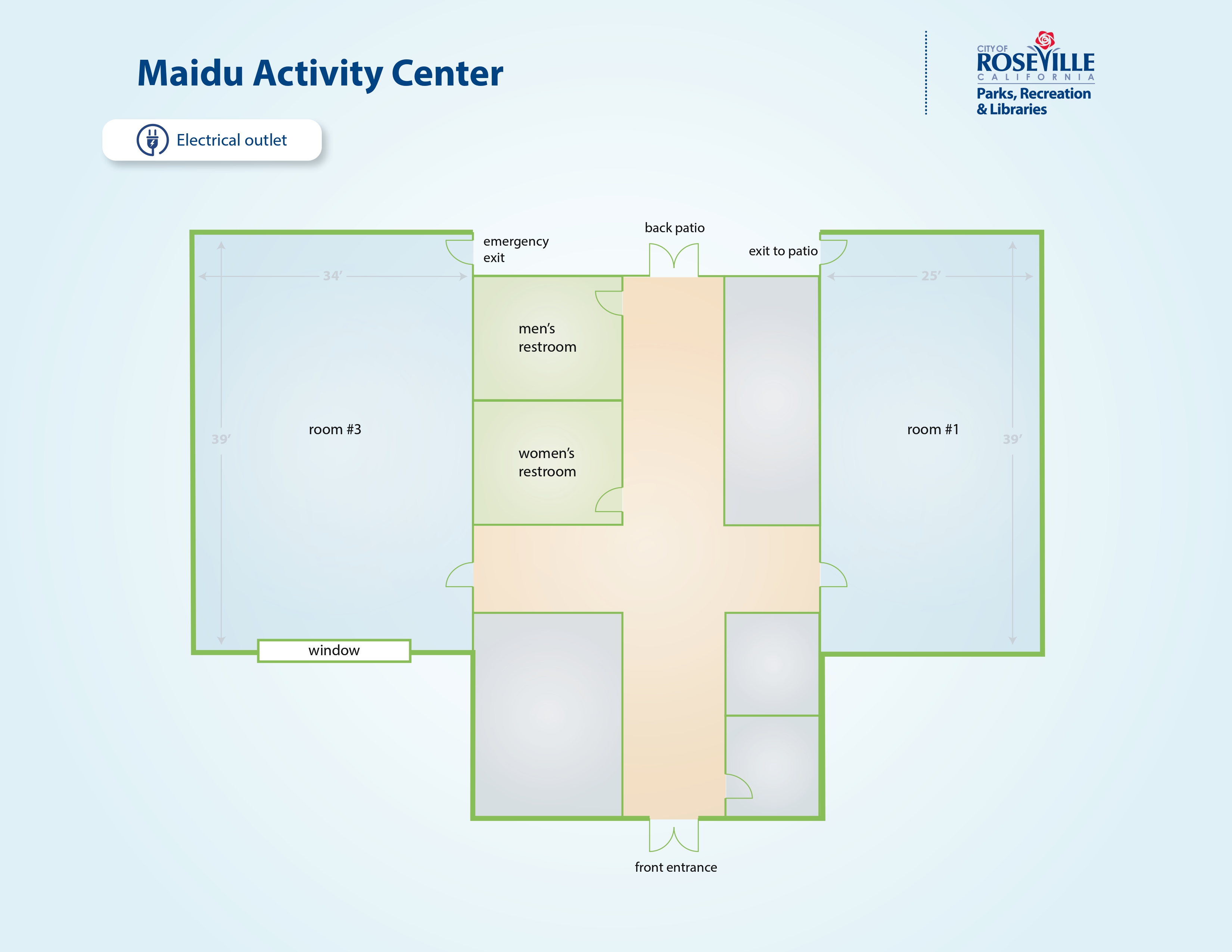 - See the Maidu Activity Center Facility layout or explore individual spaces and their amenities below.