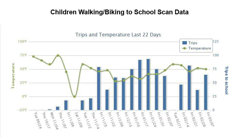 Active 4 Me (Also referred to as Scan & Notify) uses barcode technology to capture trips to school and computes the impact each trip has on CO2, gas, dollars, and calories. Each student is given a barcode tag and it’s entered into the Active 4 Me database. On program days, a volunteer scans in each student as they arrive, capturing that trip. This data can then be summarized and posted on the school's web site.