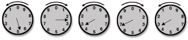 Reading an analog meter is like reading the dial of a clock. Just start at the right and write down the reading of each dial from right to left. Each dial turns in the opposite direction to the one before it. Before you read your dial meter, check the direction of your dials. If the pointer is between two numbers, read the number the pointer has just passed, always the lowest number, making sure to check the direction of the dial before recording your finding. Practice on the example below: