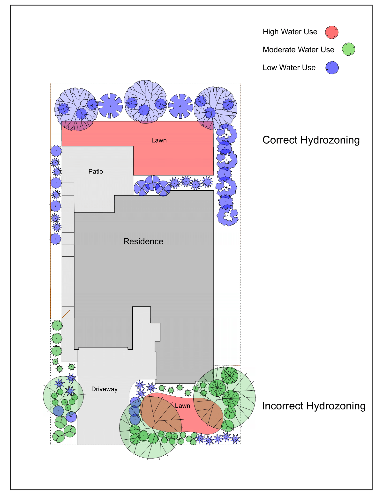 This plans shows that plants in the back yard are grouped according to their water needs, making it easier to water them efficiently. The plants are all low water-use plants.